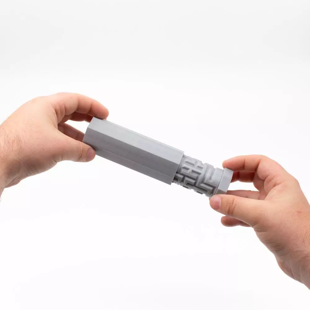 The PAZL Box consists of two cylinders that fit into each other. One contains a maze which needs to be solved to open the PAZL Box, the other contains the according counterpiece that needs to be navigated through the maze. If you are not able to find the exit or if impatience and the excitement of what is hidden inside the box take over, there is solution available for every maze.