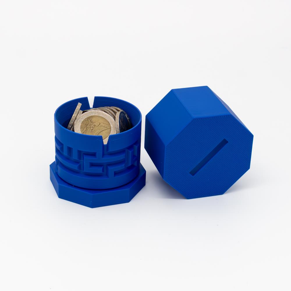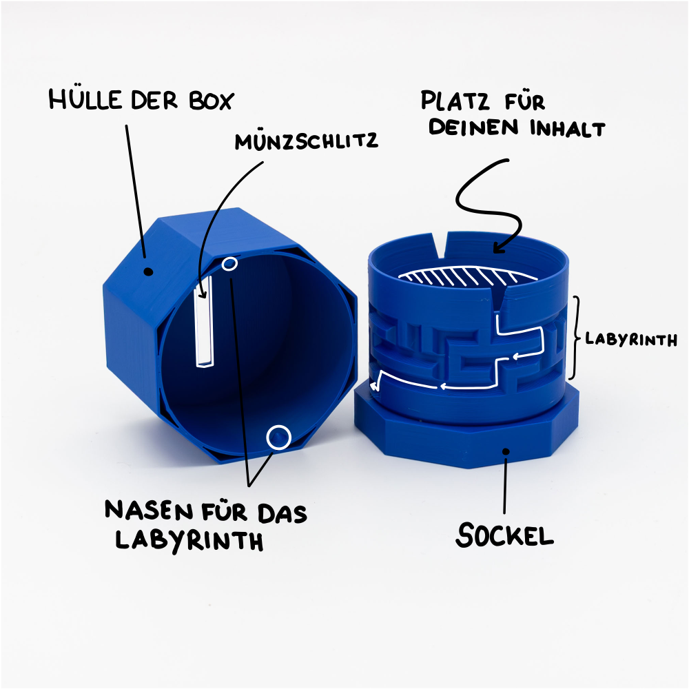 With its coin slot it is perfectly suited as savings box which can only be opened by those who have enough patience to find the exit of the maze. If you are not able to find the exit or if impatience and the excitement of what is hidden inside the box take over, there is a solution available for every maze