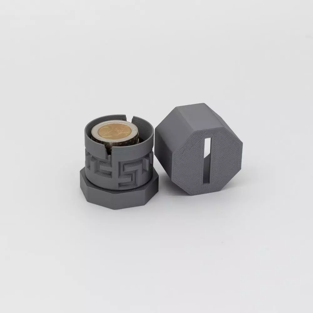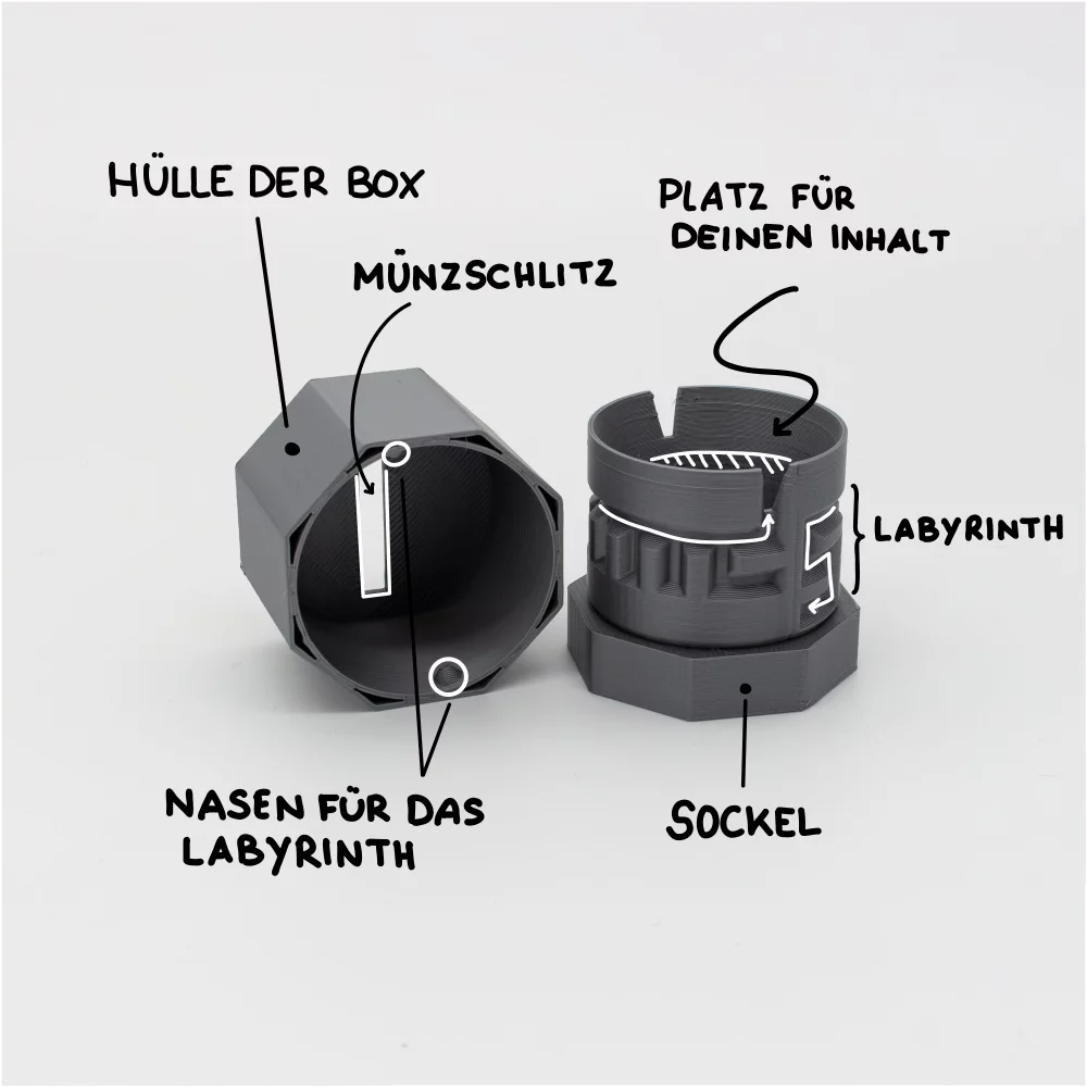 The PAZL Box consists of two cylinders that fit into each other. One contains a maze which needs to be solved to open the PAZL Box, the other contains the according counter piece that needs to be navigated through the maze. If you are not able to find the exit or if impatience and the excitement of what is hidden inside the box take over, there is a solution available for every maze.