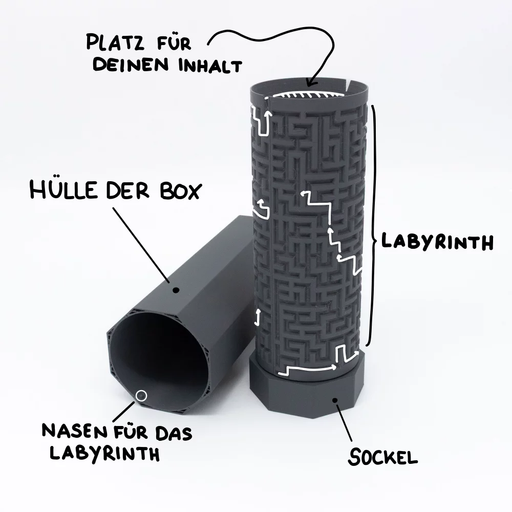 The PAZL Box consists of two cylinders that fit into each other. One contains a maze which needs to be solved to open the PAZL Box, the other contains the according counter piece that needs to be navigated through the maze. If you are not able to find the exit or if impatience and the excitement of what is hidden inside the box take over, there is a solution available for every maze.